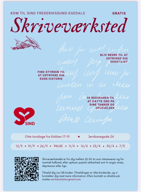 Skriveværkstedet er for dig mellem 22 og 30 år, som interesserer dig for mentalt helbred og måske selv oplever psykisk sårbarhed som fx angst, stress, depression eller lignende. Du behøver ikke have skrevet før – bare du har lyst.